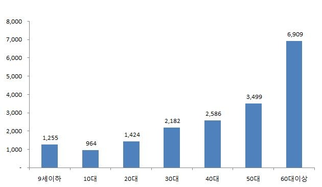 2017³â ±âÁØ ¿¬·É´ëº° Áø·áÇöȲÀ» »ìÆìº¸¸é 60´ë ÀÌ»ó(6909¸í, 36.7%)ÀÌ °¡Àå ¸¹¾Ò°í 50´ë(3499¸í, 18.6%), 40´ë(2586¸í, 13.7%) ¼øÀ¸·Î ³ªÅ¸³µ´Ù.
