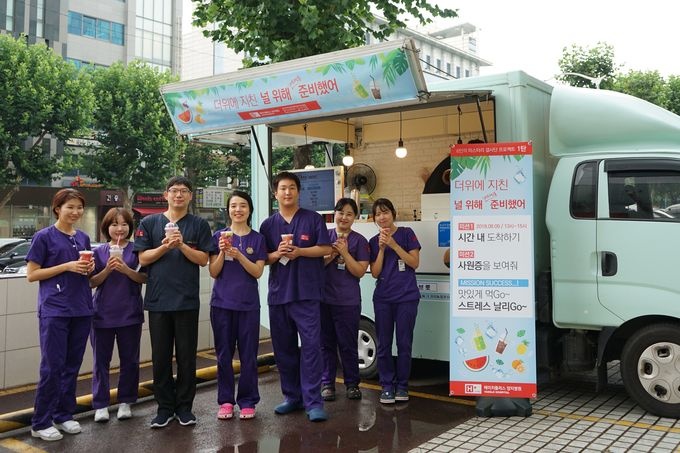 º´¿ø ÃøÀº ¼öÁ¦Ã»À½·á, À¯±â³óÂ÷, ÄŰúÀÏ µî ºñŸ¹Î °£½ÄÀ» ¹«ÇÑÁ¦°øÇØ 700¿© ¸íÀÇ º´¿ø ÀÇ·áÁø°ú Á÷¿ø ¸ðµÎ ½Ã¿øÇÑ À½·á¸¦ Áñ±â¸ç À̳¯ ÇÏ·ç ½ºÆ®·¹½º¿Í ÇÔ²² ¹«´õÀ§¸¦ ¾Ä¾î³Â´Ù.