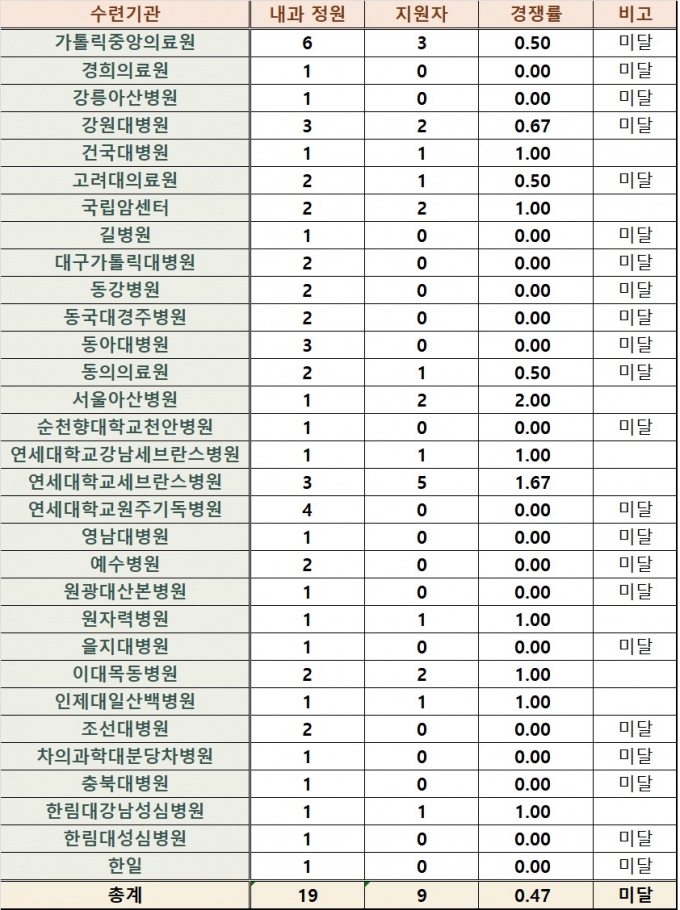µ¥Àϸ®¸Þµð°¡ Àü±¹ ÁÖ¿ä ¼ö·Ãº´¿øÀÇ Àü°øÀÇ ¸ðÁý ÇöȲÀ» ÆÄ¾ÇÇÑ ¹Ù¿¡ µû¸£¸é °³²¼¼ºê¶õ½ºº´¿ø(Á¤¿ø 1¸í, Áö¿ø 1¸í), °Ç±¹´ëº´¿ø(Á¤¿ø 1¸í, Áö¿ø 1¸í), ±¹¸³¾Ï¼¾ÅÍ(Á¤¿ø 2¸í, Áö¿ø 2¸í), ¼¿ï¾Æ»êº´¿ø(Á¤¿ø 1¸í, Áö¿ø 2¸í), ¼¼ºê¶õ½ºº´¿ø(Á¤¿ø 3¸í, Áö¿ø 5¸í), ¿øÀڷº´¿ø(Á¤¿ø 1¸í, Áö¿ø 1¸í), ÀÏ»ê¹éº´¿ø(Á¤¿ø 1¸í, Áö¿ø 1¸í), °³²¼º½Éº´¿ø(Á¤¿ø 1¸í, Áö¿ø 1¸í) µîÀÌ ¾ÈµµÀÇ ÇѼûÀ» ³»½¬¾úÀ» »ÓÀÌ´Ù.