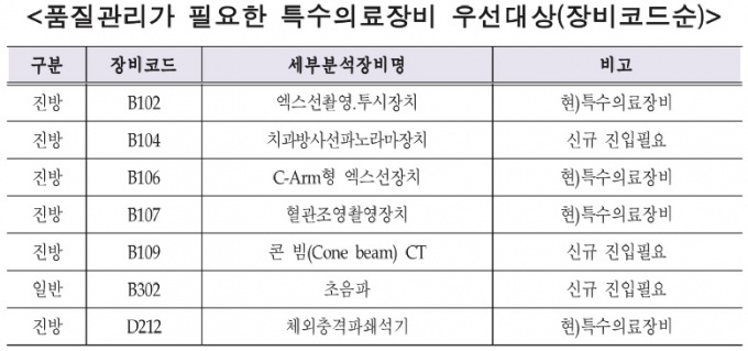 °á±¹ ½ÇÁúÀû °ü¸®°¡ °¡´ÉÇÑ ¿µ¿ª¿¡¼ Ư¼öÀÇ·áÀåºñ 8Á¾À» À¯Áö ¹× ±³Ã¼ÇØ¾ß ÇÑ´Ù´Â ÀǰßÀÌ ³ª¿Ô´Ù. ƯÈ÷ ±âÁ¸ Ç׸ñ¿¡ ÃÊÀ½ÆÄ, ÄܺöCT, Ä¡°ú¹æ»ç¼±ÆÄ³ë¶ó¸¶¸¦ ½Å±Ô·Î ÁøÀÔ½ÃÄÑ¾ß ÇÑ´Ù´Â ÁÖÀåÀÌ´Ù.