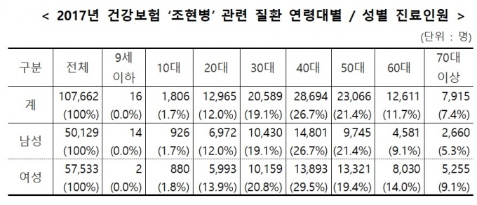 23ÀÏ ±¹¹Î°Ç°º¸Çè°ø´Ü(ÀÌ»çÀå ±è¿ëÀÍ)ÀÌ ÃÖ±Ù 5³â(2013~2017³â)ÀÇ °Ç°º¸Çè Áø·áºñ ºòµ¥ÀÌÅÍ ºÐ¼®ÇÑ °á°ú, Á¶Çöº´ ÁúȯÀ¸·Î Áø·á ¹ÞÀº ȯÀÚ´Â 2012³â 10¸¸980¸í¿¡¼ 2017³â 10¸¸7662¸íÀ¸·Î ´Ã¾î³ª ¾à 7% Áõ°¡Çß´Ù.