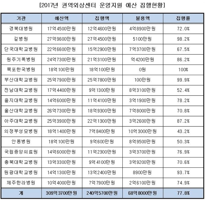 ±Ç¿ª¿Ü»ó¼¾ÅÍ ¿î¿µÁö¿ø±Ý ¿¹»êÀº 309¾ï3700¸¸¿øÀ¸·Î, ÀÌ Áß 240¾ï5700¸¸¿øÀÌ ÇØ´ç ±â°üµé¿¡°Ô Áö±ÞµÆ´Ù. ¿¹»ê ÁýÇà·üÀº 77.8%¿´´Ù.