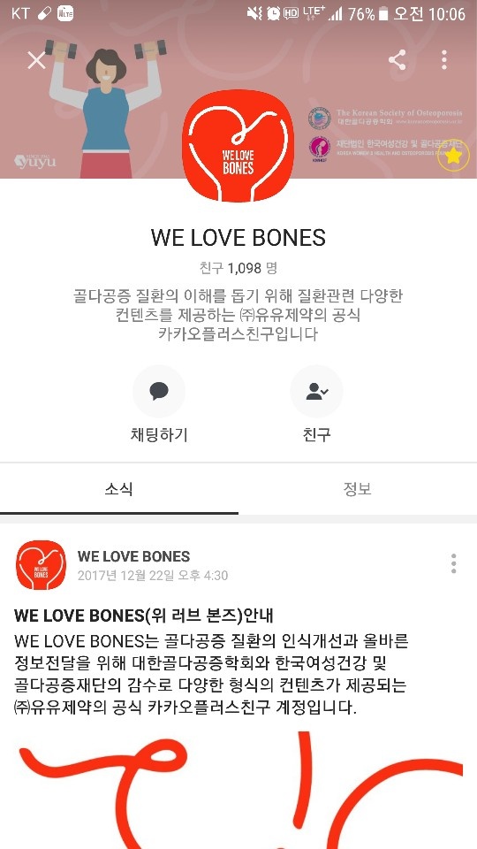 °ñ´Ù°øÁõ ÁúȯÁ¤º¸ °øÀ¯ Ä·ÆäÀÎ ‘WE LOVE BONES’´Â À¯À¯Á¦¾à°ú ´ëÇѰñ´Ù°øÁõÇÐȸ, Çѱ¹¿©¼º°Ç° ¹× °ñ´Ù°øÁõÀç´ÜÀÌ »óÈ£ Çù·ÂÇØ °ñ´Ù°øÁõ °ü·Ã ÃÖ½ÅÁö°ß°ú ¿Â¶óÀÎ °ÀÇ ¹× ½ÉÆ÷Áö¾ö, ¼º£ÀÌ µî ´Ù¾çÇÑ ÄÜÅÙÃ÷¸¦ Á¦ÀÛÇØ īī¿ÀÅå Ç÷¯½ºÄ£±¸¸¦ ÅëÇØ °øÀ¯ÇÑ´Ù.