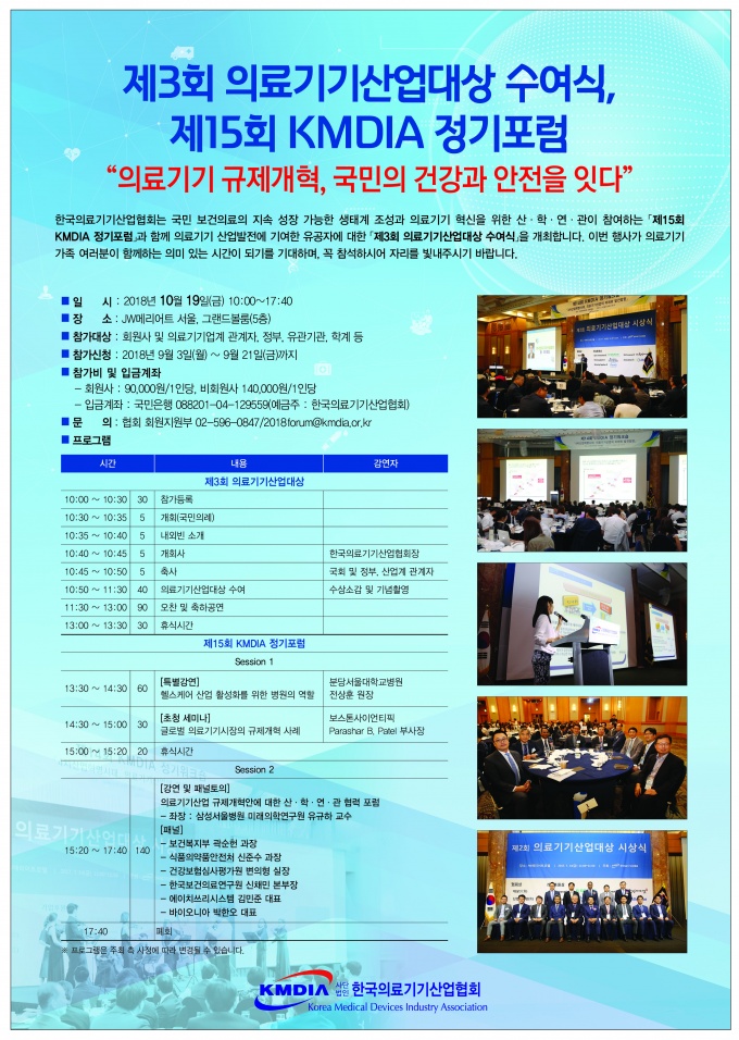 [µ¥Àϸ®¸Þµð ÇÑÇØÁø ±âÀÚ]Çѱ¹ÀÇ·á±â±â»ê¾÷Çùȸ°¡ ¿À´Â 10¿ù 19ÀÏ ¼¿ï JW ¸Þ¸®¾îƮȣÅÚ ±×·£µåº¼·ë¿¡¼ Á¦3ȸ ÀÇ·á±â±â»ê¾÷ÓÞßÛ ¼ö¿©½Ä ¹× Á¦15ȸ KMDIA Á¤±âÆ÷·³À» °³ÃÖÇÑ´Ù.
