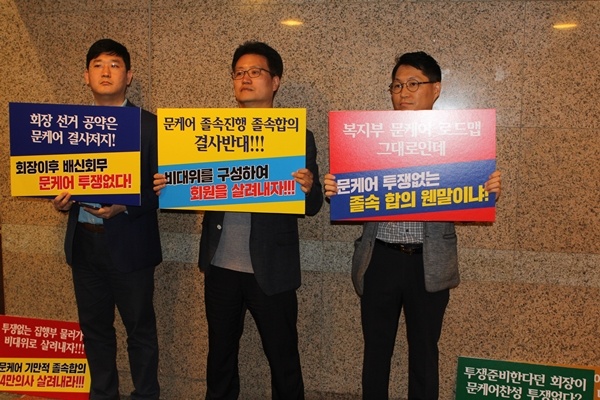 ÀÓÃÑÀÌ ¿¸®±â Àü, Çà»çÀå ¾Õ¿¡´Â ÀÇÁ¤ ÇÕÀÇ µî ÃÖ´ëÁý ȸÀåÀÇ È¸¹« ¹æ½ÄÀ» ºñÆÇÇÏ´Â ÀϺΠ´ëÀÇ¿øµéÀÇ ÇÇÄϽÃÀ§°¡ ¿·Á ´«±æÀ» ²ø¾ú´Ù. ÇÑ ´ëÀÇ¿øÀº ÃÑȸ°¡ ¿¸®´Â Çà»çÀåÀ¸·Î µé¾î¼´Â ÃÖ´ëÁýȸÀå¿¡°Ô “ÅõÀïÇ϶ó°í ȸÀåÀ¸·Î »Ì¾Æ³ù´õ´Ï Á¤ºÎ¿Í ÇÕÀǸ¦ ÇØ³õ°í¼´Â ¿©±â¿Í¼ ¾Ç¼öÇϰí ÀֳĔ°í ¼Ò¸®¸¦ Áö¸£¸ç °ÇÏ°Ô ºñÆÇÇß´Ù.