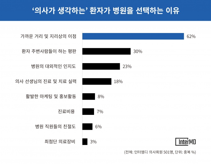 Á¶»ç°á°ú ÀÀ´äÀÚÀÇ 62%°¡ ‘°¡±î¿î °Å¸® ¹× Áö¸®»óÀÇ ÀÌÁ¡’ÀÌ º´¿øÀ» ¼±ÅÃÇÏ´Â °¡Àå Å« ÀÌÀ¯¶ó°í ÀÀ´äÇß´Ù. µÚ¸¦ ÀÌ¾î ‘ÁÖº¯»ç¶÷ÀÇ ÆòÆÇ(30%)’°ú ‘º´¿øÀÇ ´ë¿Ü ÀÎÁöµµ(23%)’ ¼øÀ̾ú´Ù.