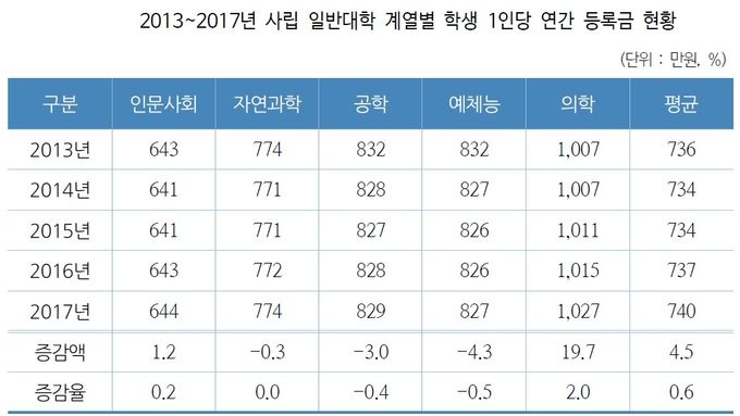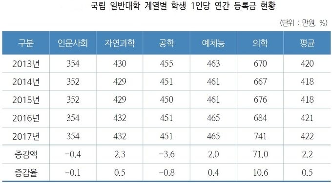 ƯÈ÷ ±¹¸³´ëÇб³ ÀÇÇаè¿ÀÌ °¡Àå Å« ÀλóÆøÀ» ±â·ÏÇß´Ù. 2013³â 670¸¸¿øÀ̾ú´ø ¿¬°£ µî·Ï±ÝÀÌ 5³â ÈÄÀÎ 2017³â¿¡´Â 741¸¸¿øÀ¸·Î 10.6%³ª Áõ°¡Çß´Ù.