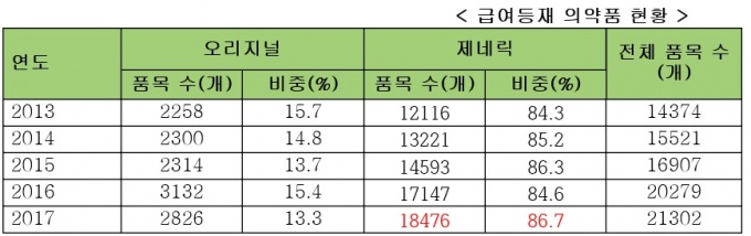 ±¹È¸ º¸°Çº¹ÁöÀ§¿øÈ¸ ¿ÀÁ¦¼¼ ÀÇ¿ø(´õºÒ¾î¹ÎÁÖ´ç)ÀÌ °Ç°º¸Çè½É»çÆò°¡¿øÀ¸·ÎºÎÅÍ Á¦Ãâ ¹ÞÀº ÀÚ·á¿¡ µû¸£¸é 2017³â ±¹³» ±Þ¿© ÀǾàǰ 2¸¸1302°³ Áß Á¦³×¸¯ÀÌ 1¸¸8476°³·Î Àüü 86.7%¸¦ Â÷ÁöÇÏ´Â °ÍÀ¸·Î ³ªÅ¸³µ´Ù.