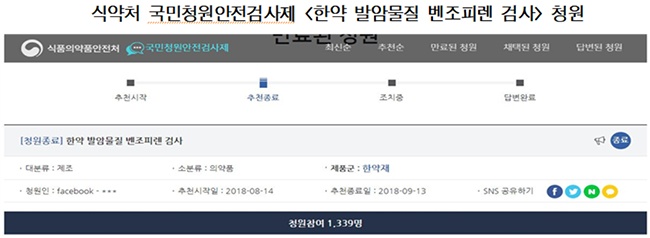 °á±¹ Áö³ 9¿ù ½Ä¾àó ±¹¹Îû¿ø¾ÈÀü°Ë»çÁ¦¿¡´Â 'ÇÑ¾à ¹ß¾Ï¹°Áú º¥Á¶ÇÇ·» °Ë»ç' û¿øÀÌ ¿Ã¶ó¿ÔÀ¸¸ç, Âü¿©ÀοøÀÌ 1339¸í¿¡ ´ÞÇß´Ù. ÇØ´ç û¿øÀº ¾ÆÁ÷ ó¸® ÁßÀÌ´Ù.