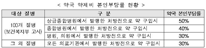 º¸°Çº¹ÁöºÎ(Àå°ü ¹Ú´ÉÈÄ)´Â 30ÀÏ ´ëÇüº´¿ø ¾àÁ¦ºñ º»Àκδã Â÷µî ÁúȯÀ» È®´ëÇÑ´Ù°í ¹àÇû´Ù. Àû¿ë½ÃÁ¡Àº 11¿ù 1ÀϺÎÅÍ´Ù.