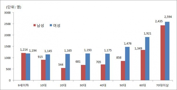 ¼ºº°·Î ±¸ºÐÇÏ¸é ¿©¼ºÀÌ 37¸¸¸íÀ¸·Î ³²¼º 24¸¸6000¸í ´ëºñ 1.5¹è ȯÀÚ°¡ ¸¹¾Ò´Ù. Àα¸ 10¸¸¸í´ç ±âÁØÀ¸·Î ºÐ¼®Çصµ ¿©¼ºÀº 1458¸í, ³²¼ºÀº 963¸íÀ¸·Î ¿©¼ºÀÌ ³²¼ºº¸´Ù ¼ÒȺҷ®À» ´õ ¾Î°í ÀÖ´Â °ÍÀ¸·Î ÆÄ¾ÇµÆ´Ù.