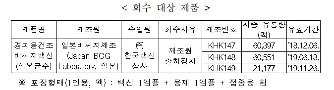 [µ¥Àϸ®¸Þµð ±èÁø¼ö ±âÀÚ] ½ÄǰÀǾàǰ¾ÈÀüó(óÀå ·ù¿µÁø)´Â ÀϺ» ÈÄ»ý¼ºÀÌ 1¼¼ ¹Ì¸¸ÀÇ ¿µ¾Æ¿¡°Ô Á¢Á¾µÇ´Â BCG ¹é½Å ÷ºÎ¿ë¾×(»ý¸®½Ä¿°¼öÁÖ»ç¿ëÁ¦)¿¡¼ ±âÁØÀ» ÃʰúÇÏ´Â ºñ¼Ò°¡ °ËÃâµÅ ÃâÇϸ¦ Á¤ÁöÇß´Ù°í ¹ßÇ¥ÇÔ¿¡ µû¶ó ÇØ´ç Á¦Ç°À» ȸ¼öÇÑ´Ù°í 7ÀÏ ¹àÇû´Ù.