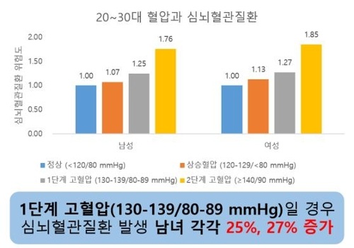¼¿ï´ëº´¿ø °¡Á¤ÀÇÇаú ¹Ú»ó¹Î ±³¼öÆÀÀÌ ±¹¹Î°Ç°º¸Çè°ø´Ü ºòµ¥ÀÌÅ͸¦ Ȱ¿ëÇØ Áö³ 2002³âºÎÅÍ 2005³â±îÁö °Ç°°ËÁøÀ» ¹ÞÀº 20~30´ë ³²³à 248¸¸ ¸íÀÇ ÀڷḦ ºÐ¼®ÇÑ °á°ú, ¼öÃà±â Ç÷¾ÐÀÌ 130~139§®HgÀÎ °æ¿ì 120 ¹Ì¸¸ Á¤»óÇ÷¾Ð¿¡ ºñÇØ ½É³úÇ÷°üÁúȯ ¹ß»ý À§ÇèÀÌ ³²¼ºÀº 25%, ¿©¼ºÀº 27% Áõ°¡ÇÏ´Â °ÍÀ¸·Î È®ÀεƴÙ.