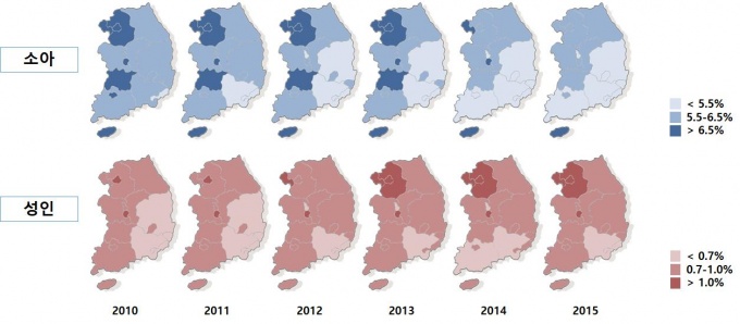 2010³â~2015³â Áö¿ªº° À¯º´·ü ÃßÀ̸¦ »ìÆìº¸¸é, ¼Ò¾Æ¿¡¼´Â ¿¬µµ¿¡ µû¶ó Á¡Â÷ °¨¼Ò, ¼ºÀο¡¼´Â ¿¬µµ¿¡ µû¶ó Á¡Â÷ Áõ°¡ÇÏ´Â °ÍÀ¸·Î ³ªÅ¸³µ´Ù.