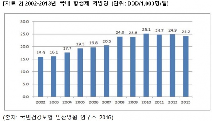 ½ÇÁ¦ Çѱ¹Àº OECD ±¹°¡ Áß ¼¼ ¹øÂ°·Î Ç×»ýÁ¦¸¦ ¸¹ÀÌ »ç¿ëÇÑ´Ù. 2016³â OECD Åë°è¿¡ µû¸£¸é ±¹³» ÃÑ Ç×»ýÁ¦ 󹿷®Àº 2002³â ÇÏ·ç 1000¸í´ç 15.9¸í¿¡¼ 2013³â 24.2¸íÀ¸·Î ²ÙÁØÈ÷ ´Ã¾ú´Ù.