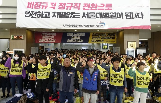 ÇÑÆí ¹ÎÁÖ³ëÃÑ °ø°ø¿î¼ö³ëÁ¶ ÀǷῬ´ëº»ºÎ ¼¿ï´ëº´¿øºÐȸ´Â ÆÄ°ß ¹× ¿ë¿ª¾÷ü ³ëµ¿ÀÚµéÀÇ Á÷Á¢°í¿ë Á¤±ÔÁ÷ ÀüȯÀ» ¿ä±¸ÇÏ¸ç ¿ø‧ÇÏû Á÷¿øµéÀÌ ÇÔ²² ¿¬´ë ÅõÀïÀ» ÁøÇà ÁßÀÌ´Ù.