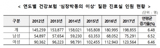 21ÀÏ ±¹¹Î°Ç°º¸Çè°ø´Ü(ÀÌ»çÀå ±è¿ëÀÍ)ÀÇ °Ç°º¸Çè ºòµ¥ÀÌÅÍ ºÐ¼®°á°ú¿¡ µû¸£¸é ½ÉÀå¹Úµ¿ ÀÌ»ó ÁúȯÀÚ´Â 2012³â 14¸¸5000¸í¿¡¼ 2017³â 19¸¸9000¸íÀ¸·Î 5³â°£ 37% ´Ã¾ú´Ù. °Ç°º¸Çè Áø·áºñ´Â 133¾ï¿ø¿¡¼ 282¾ï¿øÀ¸·Î ¾à 2¹è Áõ°¡Çß´Ù.