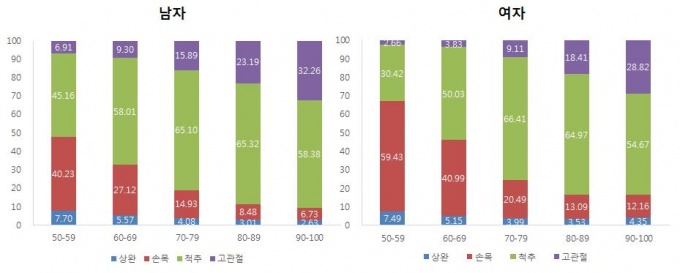 °ñÀý ºÎÀ§º°·Î »ìÆìº¸¸é ôÃß(88.4¸í), ¼Õ¸ñ(40.5¸í), °í°üÀý(17.3¸í), »ó¿Ï(7.2¸í) ¼øÀ̾úÀ¸³ª, ¿¬·É´ëº° ¼¼ºÎÀûÀ¸·Î »ìÆìº¸¸é 50´ë¿¡´Â ¼Õ¸ñ °ñÀýÀÌ ÁÖ·Î ¹ß»ýÇßÀ¸¸ç °í¿¬·ÉÀ¸·Î °¥¼ö·Ï °í°üÀý ¹× ôÃß °ñÀý ¹ß»ý·üÀÌ Áõ°¡Çß´Ù.