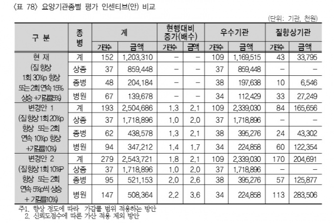 ÁÖ¸ñÇÒ Á¡Àº Àμ¾Æ¼ºê ±Ô¸ð¸¦ 2¹è ÀÌ»ó »óÇâ Á¶Á¤ÇÑ ¾È(äÐ)ÀÌ Á¦½ÃµÆ´Ù´Â °ÍÀÌ´Ù. ¶Ç »ó±ÞÁ¾ÇÕº´¿ø Áß½ÉÀÇ Àμ¾Æ¼ºê ÁýÁßÀ» ¾ïÁ¦Çϱâ À§ÇØ Áú(òõ) Çâ»ó ¸ñÇ¥¸¦ Á¾ÇÕº´¿ø°ú º´¿ø±Þµµ ´Þ¼º °¡´ÉÇÑ ¼öÁØÀ¸·Î Á¶Á¤ÇÏ´Â ¹æ¾Èµµ °í·ÁµÇ°í ÀÖ´Ù.