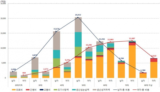 ºñ¸¸¿¡ ±âÀÎÇØ ¹ß»ýÇÏ´Â »çȸ°æÁ¦Àû ºñ¿ë¿¡ ´ëÇÑ ¼ºº° ºñÁßÀ» »ìÆìº¸¸é, ³²ÀÚ¿¡ ÀÇÇØ ¹ß»ýÇÏ´Â ºñ¿ëÀº 6Á¶4905¾ï¿ø, ¿©ÀÚ¿¡ ÀÇÇØ ¹ß»ýÇÏ´Â ºñ¿ëÀº 4Á¶9774¾ï¿øÀ¸·Î ³²ÀÚ°¡ ¿©ÀÚ¿¡ ºñÇØ 1.3¹è ¼Õ½ÇÀÌ Å©°Ô ¹ß»ýÇÏ´Â °ÍÀ¸·Î ³ªÅ¸³µ´Ù.
