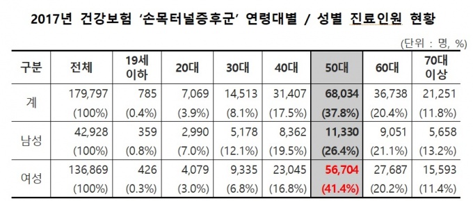 26ÀÏ ±¹¹Î°Ç°º¸Çè°ø´ÜÀÌ ºòµ¥ÀÌÅ͸¦ ºÐ¼®ÇÑ °á°ú, ÁÖ Áø´Ü¸íÀ¸·Î '¼Õ¸ñÅͳÎÁõÈıº'À» Áø·á ¹ÞÀº ȯÀÚ´Â 2013³â 16¸¸7000¸í¿¡¼ 2017³â 18¸¸¸íÀ¸·Î 7.4% Áõ°¡Çß´Ù. ¿©¼ºÀÌ ³²¼ºº¸´Ù 3.19¹è Á¤µµ ´õ ¸¹Àº °ÍÀ¸·Î ³ªÅ¸³µ´Ù.