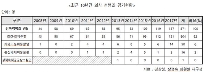 Àå ÀÇ¿øÀÌ °æÂûûÀ¸·ÎºÎÅÍ Á¦Ãâ¹ÞÀº ‘¼º¹üÁË ÀÇ»ç °Ë°Å ÇöȲ’¿¡ µû¸£¸é ÃÖ±Ù 10³â°£ ¼º¹üÁ˸¦ ¹üÇÑ ÀÇ»ç´Â 2008³â 44¸í¿¡¼ 2017³â 137¸íÀ¸·Î 3¹è°¡·® ´Ã¾ú´Ù.