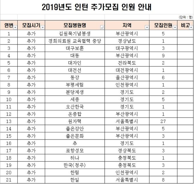 À§¿øÈ¸´Â 2019³âµµ ÀÎÅÏ Èıâ¸ðÁý º´¿øµéÀ» ´ë»óÀ¸·Î Ãß°¡¸ðÁý ½ÅûÀ» ¹ÞÀº °á°ú Èıâ¸ðÁý¿¡¼ Á¤¿øÀ» ä¿ìÁö ¸øÇ߰ųª ÇÕ°ÝÆ÷±â·Î °á¿øÀÌ ¹ß»ýÇÑ 21°³ ¼ö·Ãº´¿øÀÌ ÀçµµÀüÇÑ´Ù.