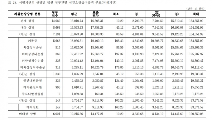 (³ª)±º »óº´(°ñ¹Ý´ëÅð°ñÀý, ÇÏÁö°üÀýġȯ µî) û±¸ °ÇÀº 1330°ÇÀ¸·Î Áý°èµÆ°í Æò±Õ ¿ä¾ç±Þ¿©ºñ´Â 182¸¸¿øÀ¸·Î Á¶»çµÆ´Ù. °ñ¹Ý´ëÅð°ñÀýÀÇ Ã»±¸´Â 333°ÇÀ¸·Î ÇÏÁö°üÀýġȯ 995°Ç ´ëºñ Àû¾úÁö¸¸ Æò±Õ ¿ä¾ç±Þ¿©ºñ´Â ³ô¾Ò´Ù.