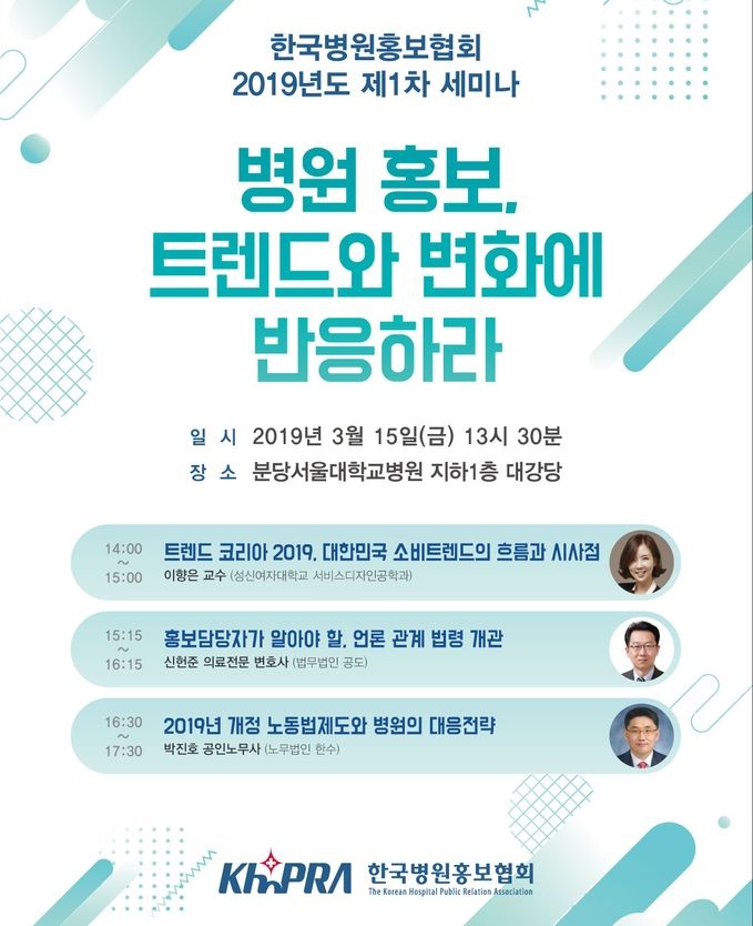 ÃÑ 3°³ÀÇ °ÀÇ·Î ±¸¼ºµÈ À̹ø ¼¼¹Ì³ª´Â ¡ãÆ®·»µå ÄÚ¸®¾Æ 2019, ´ëÇѹα¹ ¼ÒºñÆ®·»µåÀÇ È帧°ú ½Ã»çÁ¡(¼º½Å¿©ÀÚ´ëÇб³ ¼ºñ½ºµðÀÚÀΰøÇаú ÀÌÇâÀº ±³¼ö) ¡ãÈ«º¸´ã´çÀÚ°¡ ¾Ë¾Æ¾ß ÇÒ ¾ð·Ð °ü°è ¹ý·É °³°ü(¹ý¹«¹ýÀÎ °øµµ ½ÅÇåÁØ ÀÇ·áÀü¹® º¯È£»ç) ¡ã2019³â °³Á¤ ³ëµ¿¹ýÁ¦µµ¿Í º´¿øÀÇ ´ëÀÀÀü·«(³ë¹«¹ýÀÎ ÇѼö ¹ÚÁøÈ£ °øÀγ빫»ç) µî Àü¹® °»çÁøÀÇ °¿¬ÀÌ ÁغñµÅ ÀÖ´Ù.