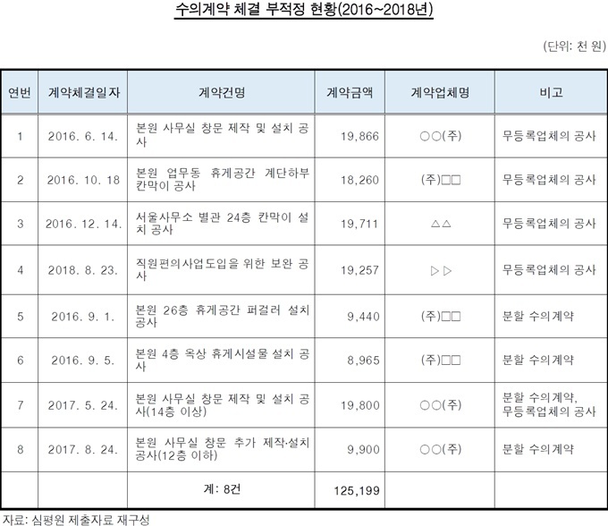 °¨»ç°á°ú ½ÉÆò¿øÀº Áö³ 2016³â 6¿ùºÎÅÍ 2018³â 8¿ù±îÁö º»¿ø »ç¹«½Ç â¹® ¼³Ä¡, ¼¿ï»ç¹«¼Ò º°°ü 24Ãþ ĸ·ÀÌ ¼³Ä¡°ø»ç µî ÃÑ 5°ÇÀ» ¹«µî·Ï¾÷ü¿Í ¼öÀǰè¾à Çß´Ù.