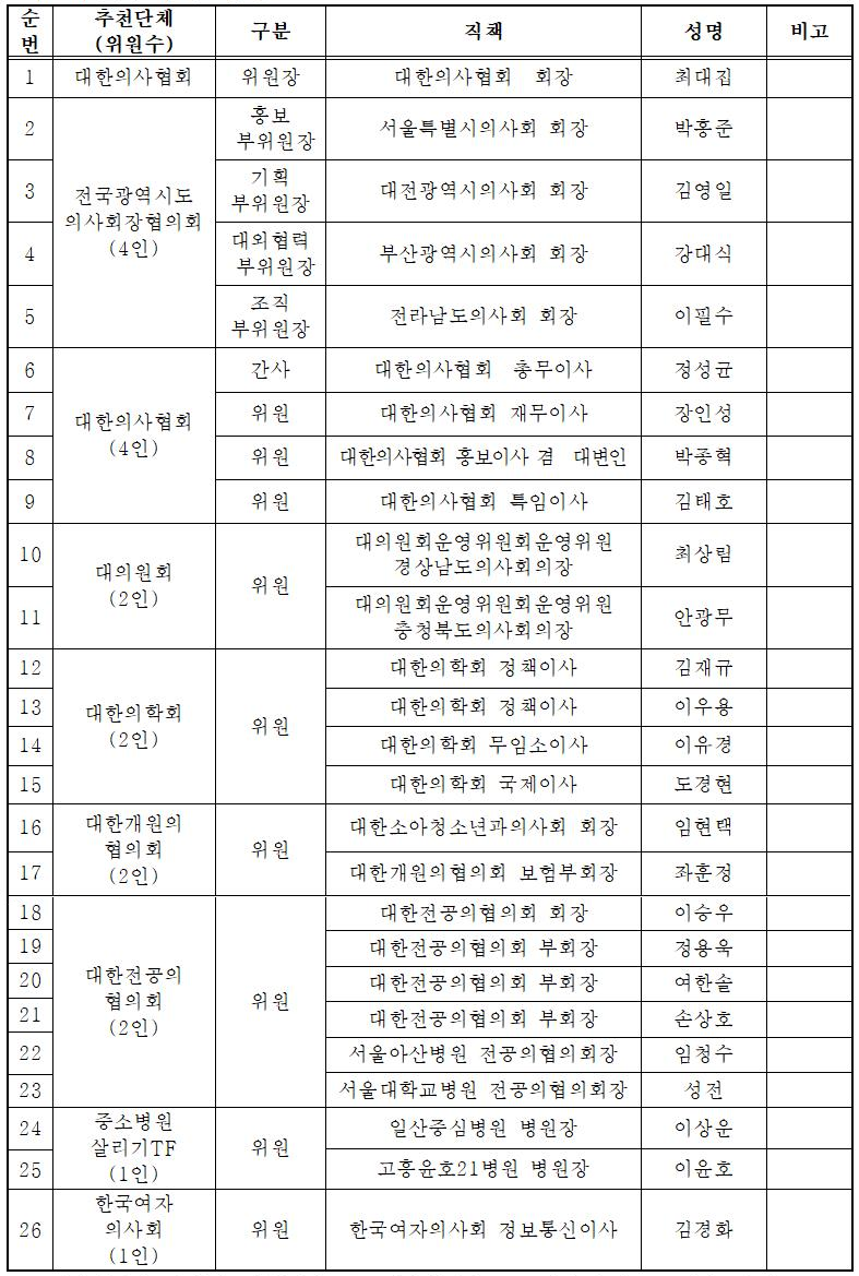 ´Ù¸¸, ÀÇÇÐȸ¿Í ´ëÀüÇù, Áß¼Òº´¿ø »ì¸®±âTF´Â Âü¿© À§¿ø ¿Ü¿¡µµ º¹¼öÀÇ ÀοøµéÀÌ Âü¿© Àǻ縦 ÇÇ·Â, ´Üüº° ÀοøÀº ¹èÁ¤Ç쵂 Âü¿©À§¿øÀ» ƯÁ¤ÇÏÁö´Â ¾Ê±â·Î Çß´Ù. Àüü ÀÇÀïÅõ ±Ô¸ð´Â 19ÀÎÀÌÁö¸¸ ÀÇÀïÅõ¿¡ Âü¿©ÇÏ´Â ÃÑ ÀοøÀº 26¸íÀ̸ç ÇâÈÄ Á¶Á¤µÉ ¼öµµ ÀÖ´Ù.