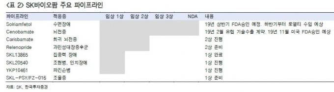 ÀÌ¿Í ´õºÒ¾î ¿ÃÇØ ÆÇ¸ÅÇã°¡ ȹµæÀÌ ¿¹»óµÇ´Â SK¹ÙÀÌ¿ÀÆÊÀÇ ¶Ç ´Ù¸¥ ½Å¾àÀº ³úÀüÁõ Ä¡·áÁ¦ ¼¼³ë¹Ù¸ÞÀÌÆ®(YKP-3089)´Ù. 2018³â 11¿ù FDA¿¡ NDA(New Drug Application)À» ½ÅûÇÏ°í ¿ÃÇØ 11¿ù 21ÀÏ FDAÀÇ ÆÇ¸ÅÇã°¡ ¿©ºÎ°¡ °áÁ¤µÈ´Ù. ÆÇ¸ÅÇã°¡¸¦ ¹ÞÀ¸¸é ·ÐĪÀº 2020³â Áß¿¡ ÀÌ·ç¾îÁú Àü¸ÁÀÌ´Ù. ÆÇ¸Å ¹× ¸¶ÄÉÆÃÀº ¹Ì±¹ ´ºÀúÁö ÇöÁö¹ýÀÎÀÎ SK¶óÀÌÇÁ»çÀ̾𽺸¦ ÅëÇØ µ¶ÀÚÀûÀ¸·Î ¼öÇàµÉ °èȹÀÌ´Ù.