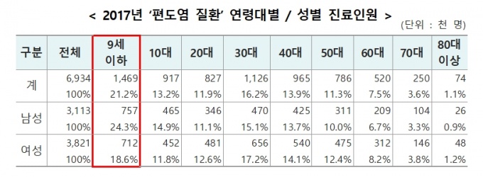 Áö³ 2017³â ‘Æíµµ¿°’ ȯÀÚ´Â 693¸¸¸íÀ¸·Î Áý°èµÆ´Âµ¥, ȯÀÚ´Â ³²³à ¸ðµÎ 9¼¼ ÀÌÇÏ¿¡¼ °¡Àå ¸¹¾Ò´Ù. 2017³â ±âÁØ 9¼¼ ÀÌÇÏ Æíµµ¿° ȯÀÚ´Â ¾à 147¸¸¸íÀ¸·Î Àüü ȯÀÚÀÇ 21.2%¸¦ Â÷ÁöÇß´Ù.