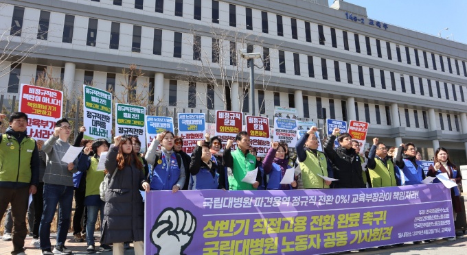 [µ¥Àϸ®¸Þµð ÇÑÇØÁø ±âÀÚ] ±¹¸³´ëº´¿ø ³ëÁ¶µéÀÌ 2ÀÏ ±³À°ºÎ ¾Õ¿¡¼ Á¤±ÔÁ÷ ÀüȯÀ» ¿ä±¸ÇÏ´Â ½ÃÀ§¸¦ °¡Á³´Ù.