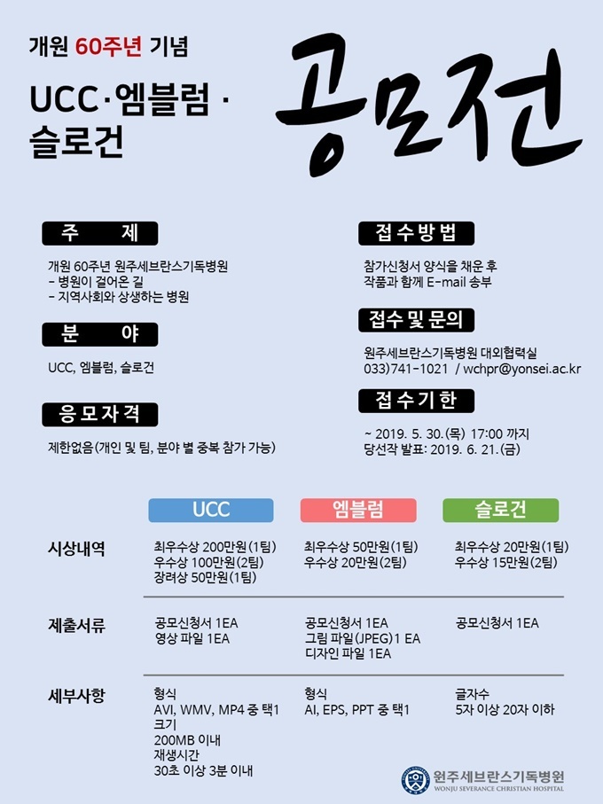 [µ¥Àϸ®¸Þµð °íÀç¿ì ±âÀÚ] ¿øÁÖ¼¼ºê¶õ½º±âµ¶º´¿øÀº ¿À´Â 5¿ù30ÀϱîÁö °³¿ø 60ÁÖ³âÀ» ±â³äÇØ UCC µî °ø¸ðÀüÀ» ¿¬´Ù°í 9ÀÏ ¹àÇû´Ù.