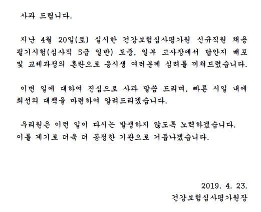 [µ¥Àϸ®¸Þµð ¹Ú±Ùºó ±âÀÚ] °Ç°º¸Çè½É»çÆò°¡¿ø ½ÅÀÔ»ç¿ø ä¿ë ½ÃÇèÀå¿¡¼ ¾û¶×ÇÑ OMR ´ä¾ÈÁö°¡ ¹èÆ÷µÇ´Â µî È¥¶õÀÌ ¹ß»ýÇß´Ù. ´ä¾ÈÁö ±³Ã¼ °úÁ¤¿¡¼ °øÁ¤¼º ½Ãºñ°¡ ºÒ°ÅÁ³´Ù.