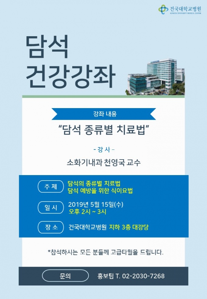 [µ¥Àϸ®¸Þµð ¹ÚÁ¤¿¬ ±âÀÚ] °Ç±¹´ëº´¿ø(º´¿øÀå Ȳ´ë¿ë)Àº ¿À´Â 15ÀÏ ¿ÀÈÄ 2½ÃºÎÅÍ 3½Ã±îÁö ¿ø³» ´ë°´ç(ÁöÇÏ 3Ãþ)¿¡¼ ‘´ã¼® Á¾·ùº° Ä¡·á¹ý°ú ½ÄÀÌ¿ä¹ý’À» ÁÖÁ¦·Î °Ç°°Á¸¦ °³ÃÖÇÑ´Ù.