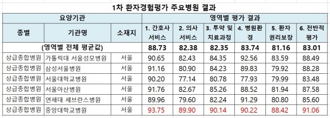 1Â÷ Æò°¡ °á°ú´Â °£È£»ç ¼ºñ½º 88.8Á¡, ÀÇ»ç ¼ºñ½º 82.3Á¡, Åõ¾à ¹× Ä¡·á°úÁ¤ 82.3Á¡, º´¿øÈ¯°æ84.1Á¡, ȯÀڱǸ®º¸Àå 82.8Á¡ µîÀ¸·Î Á¶»çµÆ´Ù.
