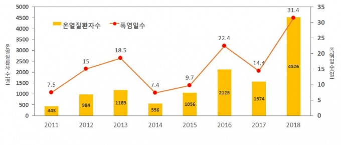 Áúº´°ü¸®º»ºÎ ÀÚ·á¿¡ µû¸£¸é, 2018³âµµ ±â·ÏÀûÀÎ Æø¿°À¸·Î ¿Â¿ÁúȯÀÚ¼ö´Â 4526¸í, ÀÌ Áß »ç¸ÁÀÚ 48¸íÀÌ ¹ß»ýÇß´Ù. ÀÌ´Â 2011³â °¨½Ãü°è ¿î¿µÀ» ½ÃÀÛÇÑ ÀÌ·¡ ÃÖ°íÄ¡´Ù. ½ÇÁ¦·Î ÀÛ³â Æø¿°Àϼö´Â 31.5ÀÏ, ¿´ë¾ßÀϼö 17.7ÀÏ·Î 1973³â ÀÌÈÄ ¿ª´ë±Þ ´õÀ§¸¦ ±â·ÏÇß´Ù.
