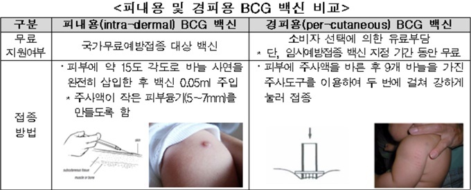 Á¢Á¾¹æ¹ý¿¡ µû¶ó Çdz»¿ë BCG ¹é½Å(ÁÖ»çÇü)°ú °æÇÇ¿ë BCG ¹é½Å(µ¿ÀåÇü)À¸·Î ºÐ·ùµÇ¸ç, Á¤ºÎ´Â ¼¼°èº¸°Ç±â±¸(WHO) ±Ç°í¿¡ µû¶ó Çdz»¿ë BCG ¹é½ÅÀ» ±¹°¡Çʼö ¿¹¹æÁ¢Á¾ ¹é½ÅÀ¸·Î ÁöÁ¤ÇØ ¹«·á·Î Áö¿øÇϰí ÀÖ´Ù.