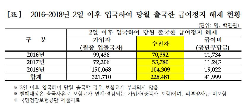 º¸Çè·á ³³ºÎ ¾øÀÌ ±Þ¿©¸¸ ¹Þ¾Æ°£ ‘¸ÔÆ¢ ¿ùÁß ÀÔÃâ±¹ÀÚ’´Â 2016³â 7¸¸392¸í¿¡¼ 2018³â 10¸¸4309¸íÀ¸·Î Áõ°¡Çß°í ÀÌ·Î ÀÎÇÑ °Çº¸ ±Þ¿©¾×µµ 2016³â 117¾ï¿ø¿¡¼ 2018³â 190¾ï¿øÀ¸·Î ´Ã¾ú´Ù.