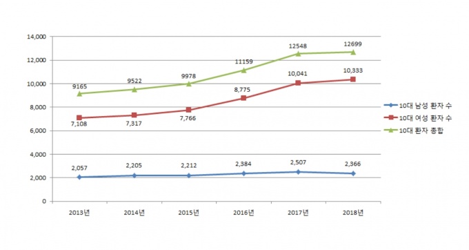 10´ë ¿©¼º ¼ºº´ ȯÀÚ´Â 2013³â 7108¸í, 2014³â 7317¸í, 2015³â 7766¸í, 2016³â 8775¸í, 2017³â 1¸¸41¸í, 2018³â 1¸¸333¸íÀ¸·Î ÃÖ±Ù 5³â »õ ¾à 45.4% Áõ°¡Çß´Ù.