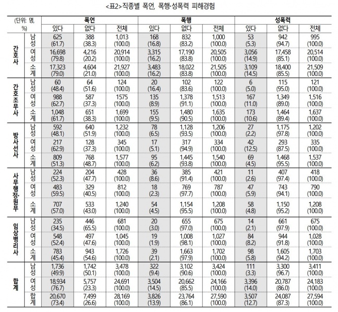 °è¼ÓÇØ¼ ÁÖ¿ä Á÷Á¾º°·Î ºñ±³ÇØ º¸¸é, Æø¾ð ÇÇÇØ °æÇèÀº °£È£»ç(79%)°¡ °¡Àå ³ô¾Ò°í, °£È£Á¶¹«»ç(61.7%), »ç¹«ÇàÁ¤ ¹× ¿ø¹«(57%), ¹æ»ç¼±»ç(51.3%), ÀÓ»óº´¸®»ç(45.4%)°¡ µÚ¸¦ À̾ú´Ù.