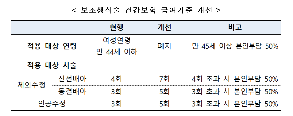 ÇöÀç ³ÀÓÄ¡·á½Ã¼úÀº ¹ýÀû È¥ÀÎ °ü°è¿¡ ÀÖ´Â ¿©¼º ¿¬·É ¸¸ 44¼¼ ÀÌÇÏ ³ÀӺκο¡ ´ëÇØ ü¿Ü¼öÁ¤½Ã¼ú ½Å¼±¹è¾Æ 4ȸ, µ¿°á¹è¾Æ 3ȸ, Àΰø¼öÁ¤½Ã¼ú 3ȸ¿¡ ´ëÇØ °Ç°º¸ÇèÀ» Àû¿ëÇϰí ÀÖ´Ù.