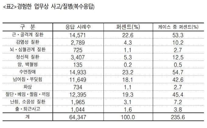 ¾÷¹« Áß °æÇèÇÑ »ç°í³ª Áúº´À¸·Î´Â ¼ö¸éÀå¾Ö°¡ 54.7%(º¹¼öÀÀ´ä)·Î °¡Àå ¸¹¾Ò´Ù. ÀÌ¾î ±Ù°ñ°Ý°è Áúȯ(53.3%), Àý´Ü·º£ÀÓ·Âñ¸²·³¢ÀÓ(45.4%), ³Ñ¾îÁü·ºÎµúÈû(42.6%), Á¤½ÅÀû Áúȯ(12.5%) ¼øÀ¸·Î Á¶»çµÆ´Ù. °¨¿°¼º ÁúȯÀ» °ÞÀº ³ëµ¿ÀÚµµ 10.2%¿¡ ´ÞÇß´Ù.