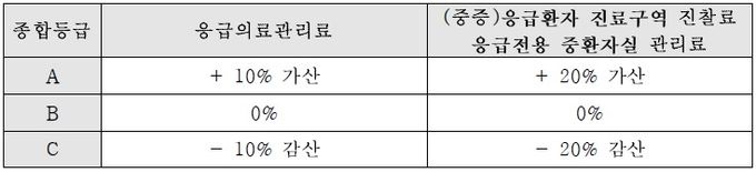 Aµî±Þ ±â°üÀº ÀÀ±ÞÀÇ·á°ü¸®·á 10% °¡»ê, ÀÀ±ÞȯÀÚ Áø·á±¸¿ª ÁøÂû·á ¹× ÀÀ±ÞÀü¿ë ÁßȯÀÚ½Ç °ü¸®·á 20%¸¦ ´õ ¹Þ´Â´Ù. ¹Ý¸é Cµî±Þ ÆÇÁ¤À» ¹ÞÀº ±â°üÀº °¢°¢ 10%¿Í 20%¾¿ °¨»êµÈ´Ù.