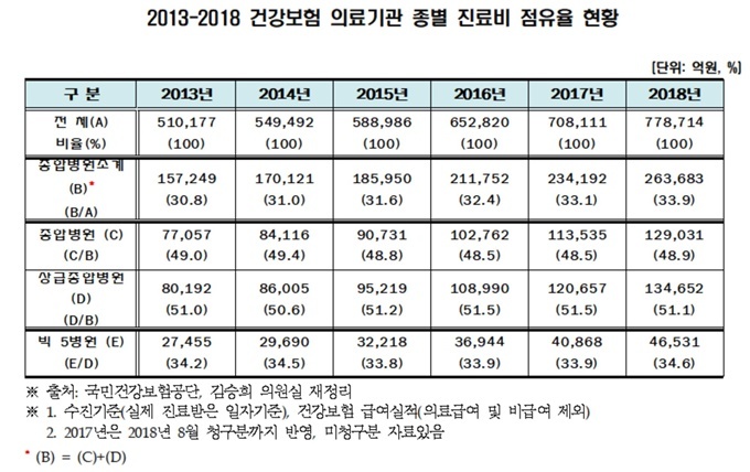 Áö³ÇØ Àüü Áø·áºñ Áß Á¾ÇÕº´¿ø Áø·áºñ Á¡À¯À²Àº 33.9%(26Á¶ 3683¾ï¿ø)À¸·Î 2017³â ´ëºñ 0.8% Áõ°¡Çß´Ù.