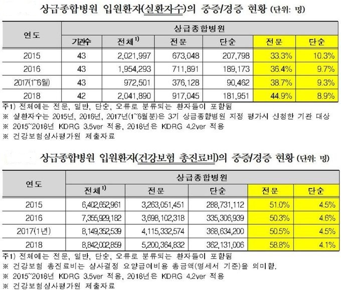 ¶ÇÇÑ »ó±ÞÁ¾ÇÕº´¿ø ÀÔ¿øÈ¯ÀÚÀÇ ÃÑÁø·áºñ´Â 2015³â 6Á¶4026¾ï¿ø¿¡¼ 2018³â 8Á¶8420¾ï¿øÀ¸·Î ´Ã¾ú´Ù. ÁßÁõȯÀÚ ÃÑÁø·áºñ ºñÀ²Àº 51.0%¿¡¼ 58.8%·Î ³ô¾ÆÁø ¹Ý¸é °æÁõȯÀÚ ÃÑÁø·áºñ ºñÀ²Àº 4.5%¿¡¼ 4.1%·Î ÁÙ¾ú´Ù.
