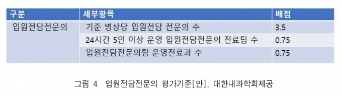 Æò°¡Ç׸ñÀº ±âÁØ º´»ó´ç ÀÔ¿øÀü´ãÀü¹®ÀÇ ¼ö(70%), 24½Ã°£ 5ÀÎ ÀÌ»ó ¿î¿µ ÀÔ¿øÀü´ãÀü¹®ÀÇ Áø·áÆÀ ¼ö(15%), ÀÔ¿øÀü´ãÀü¹®ÀÇÆÀ ¿î¿µÁø·á°ú ¼ö(15%)·Î ³ª´¶´Ù.