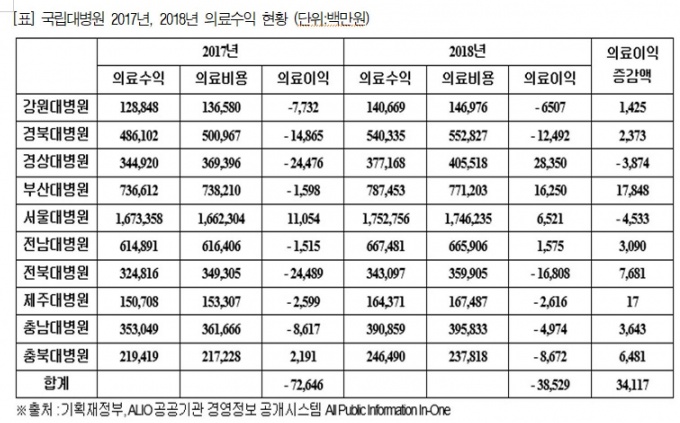 ½ÇÁ¦·Î °ø°ø±â°ü °æ¿µÁ¤º¸ °ø°³½Ã½ºÅÛ °ø½Ã¿¡ µû¸£¸é ºÎ»ê´ëº´¿ø ÀÇ·áÀÌÀÍÀº 2017³â¿¡´Â 15¾ï 9800¸¸¿ø ÀûÀÚ¿´À¸³ª 2018³â¿¡´Â 162¾ï5000¸¸¿øÀÇ ÈæÀÚ¸¦ ±â·ÏÇß´Ù. 2018³â ±¹¸³´ëº´¿ø Áß ÀÇ·áÀÌÀÍÀÌ °¡Àå ¸¹ÀÌ Áõ°¡Çß´Ù.